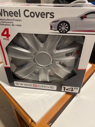 Set de 4 tapacubos SWISS DRIVE de 14 pulgadas. - Diseño GTx con acabado plateado y detalles en carbono. - Compatibles con llantas de 14 pulgadas.