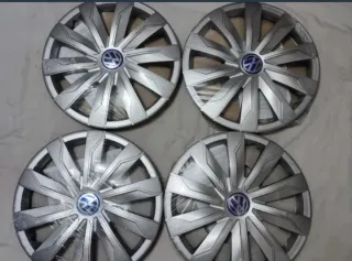 Juego de cuatro tapacubos para llantas de 15 pulgadas de Volkswagen. Dale un nuevo look a tu coche. - Diseño plateado. - Logo de Volkswagen en el centro. - Fabricados en plástico resistente. Originales en oerfecto estado el precio es el del anuncio gracias