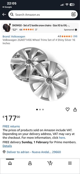4 tapacubos Volkswagen y 4 llantas de acero. Originales. En perfecto estado. - 16 pulgadas - Diseño plateado con logo central. Se encuentra en la provincia de Granada