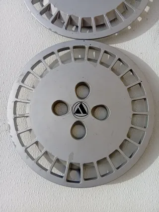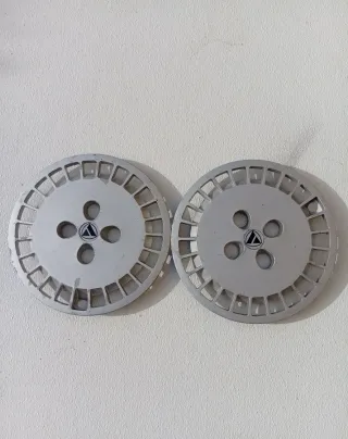 Dos tapacubos originales para Renault 11 en buen estado. - Diseño circular con patrón cuadriculado. - Color gris claro.