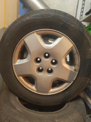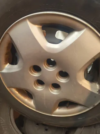 Juego de llantas de chapa con neumáticos y tapacubos. - Llantas de chapa. - Neumáticos incluidos. - Tapacubos con diseño de 5 radios. Se trata de 4 llantas de chapa con su neumático. 2 Neumáticos marca MOTRIO 165/65 R14 79T fabricadoas en la semana 35 de 2016 y 2 Neumáticos marca Michelin 165/65 R14 79T fabricadas en la semana 40 de 2016.Aún están a medio uso Se vende el lote con los tapacubos grises. Si precisan más fotos o aclaraciones no duden en pedirlas. Precio no negociable