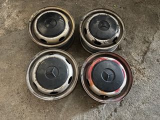 Juego de 4 llantas para Mercedes MB100 con sus tapacubos originales. - Llantas de acero. - Tapacubos negros con logo Mercedes.