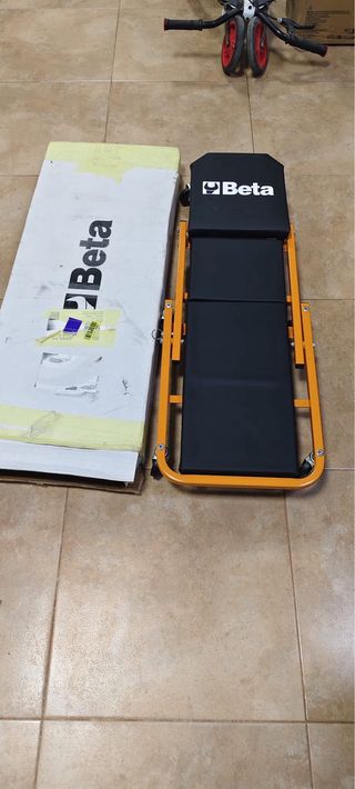 Camilla mecánica de la marca Beta, ideal para trabajar debajo del coche. Su diseño permite un fácil acceso a zonas difíciles. - Estructura metálica resistente. - Ruedas para movilidad. - Tapicería negra.