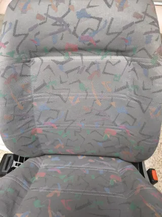 Muy buen estado para su edad, algún descosido sin importancia Siempre guardado Asiento para Volkswagen T4 Multivan, diseñado para ser instalado a contramarcha. - Tapicería con estampado geométrico en tonos grises, azules, verdes y rojos. - Estructura anclajes laterales visibles.