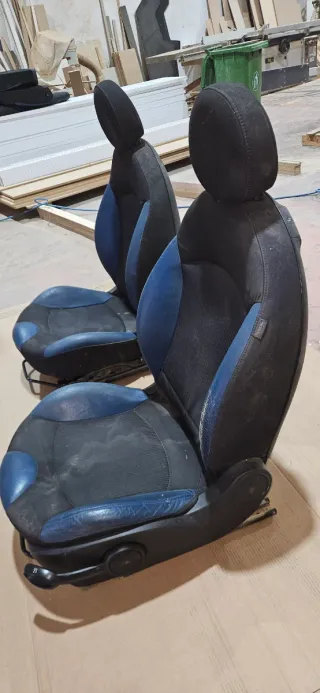 Asientos delanteros y traseros para Mini Cooper R56. Combinan tela negra y detalles en piel azul. - Tapicería mixta. - Diseño deportivo. - Incluye reposacabezas. Con manchas de polvo de madera, se entrega limpio de polvo y aspirado