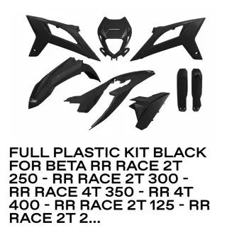 Kit completo de plásticos negros o blancos para moto Beta RR. Tengo tanto el kit completo en negro como el blanco. Marca Ufo Plast referencias BEKIT800F-001 Y BEKIT800F-043. Precio por unidad. - Incluye piezas para modelos RR Race 2T 125, 250, 300 y RR Race 4T 350, 400.