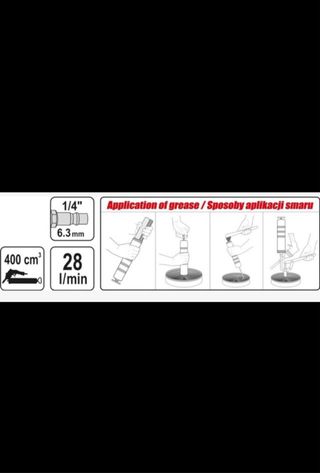 Pistola engrasadora neumática en buen estado. Incluye manguera y boquillas de engrase - Capacidad: 400 cm³ - Caudal: 28 l/min - Entrada de aire: 1/4" (6.3 mm)