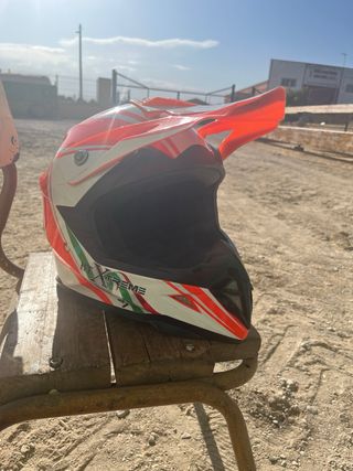 Casco de motocross con diseño llamativo en naranja y blanco. - Marca: HT Xtreme - Color: Naranja, blanco y detalles verdes. - Visera aerodinámica.