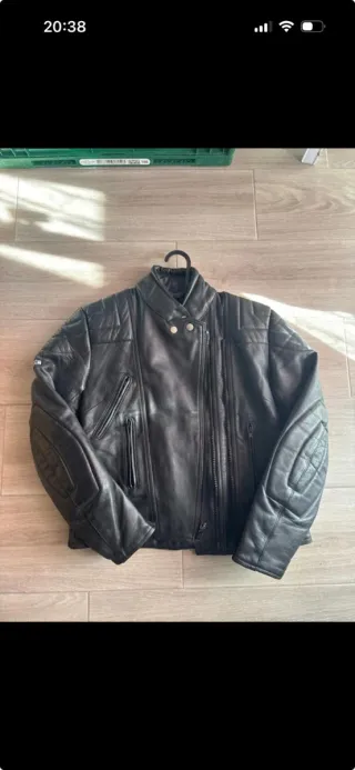 Chaqueta de piel negra para mujer, talla L, ideal para moto. Diseño clásico y resistente. - Material: Piel. - Color: Negro. - Talla: L. - Cierre frontal asimétrico con cremallera. - Cuello con botones a presión. - Múltiples bolsillos con cremallera. - Detalles acolchados en hombros y codos.