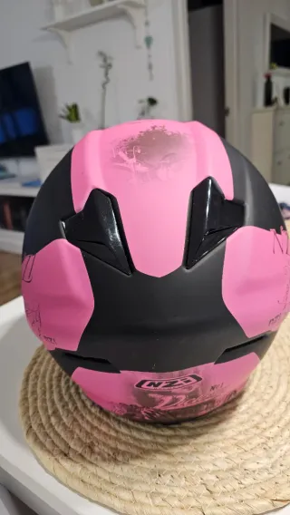 Casco de moto con un diseño llamativo en rosa y negro. Ideal para quienes buscan estilo y protección. - Diseño con franjas rosas y detalles gráficos. - Visera transparente. - Marca NZI.