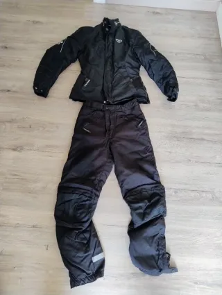 Conjunto de mono de moto para chica, ideal para la carretera. - Chaqueta negra con detalles blancos. - Pantalón negro con protecciones. - Cremalleras y bolsillos visibles.
