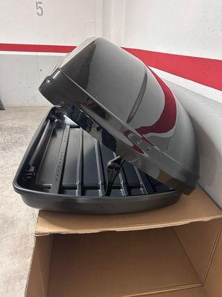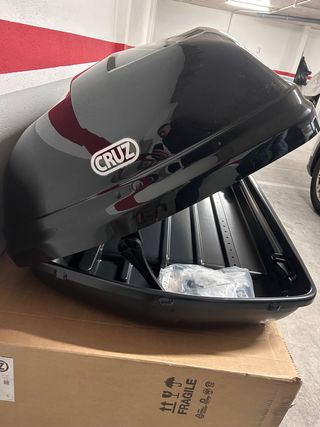 Cofre de techo de la marca CRUZ, modelo Box 340N. Es de color negro y tiene un diseño aerodinámico. - Capacidad de 340 litros. - Apertura lateral. - Cierre de seguridad.