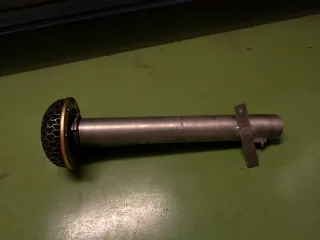 Carburador Arreche para Guzzi 65. Pieza metálica con diseño circular y rejillas. - Carcasa metálica plateada. - Diseño con múltiples aberturas en forma de sector circular. - Rejilla interior en las aberturas. - Incluye un pomo o palanca en la parte inferior.