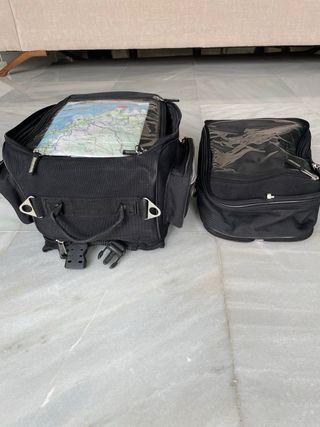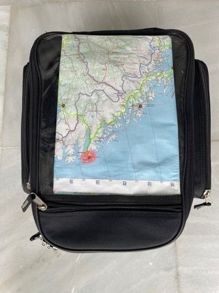 Mochila para moto, ideal para llevar sobre el depósito. Cuenta con un compartimento transparente superior para mapas o GPS. - Material textil resistente. - Cremalleras de alta calidad. - Diseño negro. Solo tiene un viaje montada en una K 1600 Gtl. ideal por la gran capacidad que tiene. Ampliable con un piso intermedio, (nuevo sin uso porque no era necesario) y tres bolsillos exteriores, el frontal extraíble tipo cartera. Es adaptable con las cintas a cualquier moto incluso al colín como bolsa trasera. Tenía imanes para depósitos metálicos que quité porque aumentaba peso.....los tengo por si quiere volver a poner.