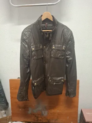Chaqueta de estilo motero en color marrón oscuro. Presenta un diseño clásico con múltiples bolsillos y detalles acolchados en los hombros. - Cierre de cremallera frontal. - Cuatro bolsillos exteriores con solapa y botón. - Cuello alto con cierre de botón. - Puños con cremallera. - Detalles acolchados en hombros.