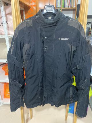 Chaqueta de moto Held en color gris oscuro. Se encuentra en buen estado. - Diseño moderno y funcional. - Cierre frontal con cremallera y botones. - Cuello alto ajustable. - Mangas con cierres de velcro. - Detalles reflectantes en hombros y mangas.