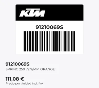 Muelle de amortiguador WP para KTM EXC del año 2012. El número de referencia es 72-250. 7,2N/mm Ref.KTM 91210069S - Color naranja. - Fabricado según la clase DIN 1.