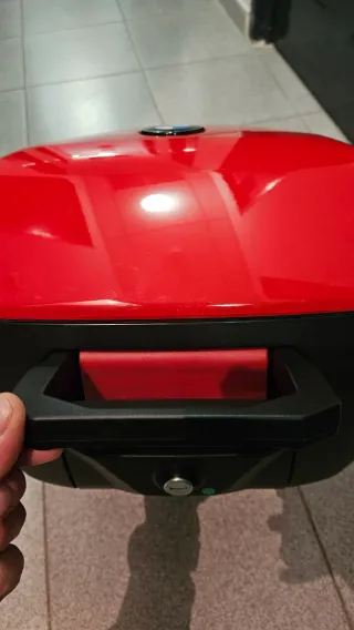 Top case para motos BMW F 750 y F 850 GS. - Fabricado en plástico negro resistente. - Incluye asa de transporte roja. - Diseño con soportes inferiores.