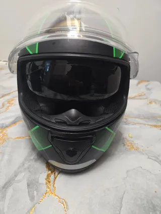 Casco integral MT Helmets en talla M. Diseño moderno en negro con detalles en verde. - Visera solar integrada. - Cierre de seguridad. - Interior cómodo y transpirable.
