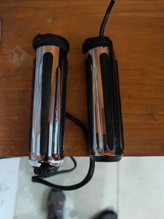 Puños calefactables para Harley Davidson. Presentan daños. - Diseño cromado y negro. - Cables incluidos. - se pueden usar perfectamente como normales,no calefactables - desconozco si se pueden arreglar - los tenía montados en una Harley Davidson
