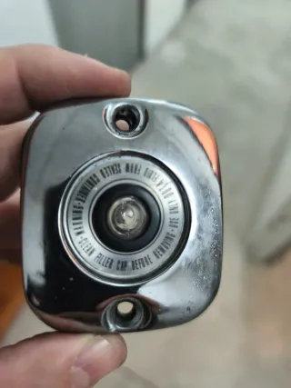 Tapa para bomba de freno de motocicleta Harley Davidson. Fabricada en metal cromado. - Incluye advertencia CLEAN FILLER CAP BEFORE REMOVING - USE ONLY DOT4 FLUID FROM SEALED CONTAINER. - Diseño con dos orificios para montaje. - apta para Harley Davidson Dyna