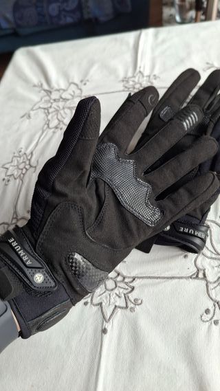 Guantes de moto de verano de la marca ARMURE, color negro. Mujer, talla L. Tela tecnica y piel de vacuno con protecciones de alta seguridad, impermeables y transpirables. Protección en nudillos, falanges, puño y palma, para evitar roturas y daños por abrasión. Apto para el uso de dispositivos de pantalla táctil sin tener que quitarse los guantes. Ajuste en muñeca con correa y cierre con velcro. Integrado WIPERBLADE. Una sistema que te permite limpiar la visera de tu casco mientras conduces tu moto, WIPERBLADE se coloca sobre el guante izquierdo. Detalles reflectantes para ser más visibles. 100% flexible para un tacto perfecto.