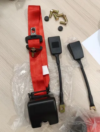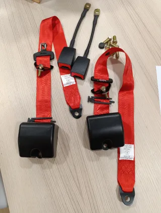 Juego de cinturones de seguridad en color rojo, compatibles con Seat 124 HOMOLOGACIÓN EUROPEA para ITV. - Incluye dos cinturones completos. Hebillas y anclajes metálicos. - Incluye tornillería para su instalación. Compatible con Seat 124,1430,127,131,132,600, ,850.... Renault 8, 5, 6,4,12, Simca,