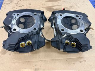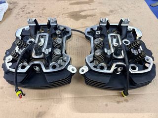 Juego de culatas para motos Harley Davidson Milwaukee 8, modelo Touring, con refrigeración liquida - Fabricadas en aluminio negro. - Diseño con aletas para disipación de calor. - Incluye componentes visibles en las imágenes.