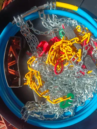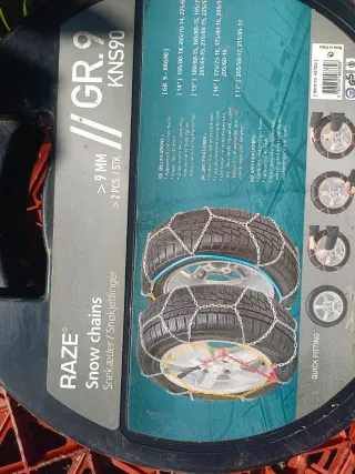 Juego de cadenas para nieve RAZE, modelo GR.9 KNS90. - Homologadas para cadenas de nieve de 9 mm. - Límite de velocidad de 40 km/h. - Incluye 2 unidades por paquete. - Compatibles con medidas de neumático: 195/80-14, 205/70-14, 225/65-15, 180/80-15, 185/80-15, 195/70-15, 205/65-15, 215/60-15, 225/55-16, 175/75-16, 175/80-16, 205/55-16, 205/60-16, 205/50-17, 215/45-17.