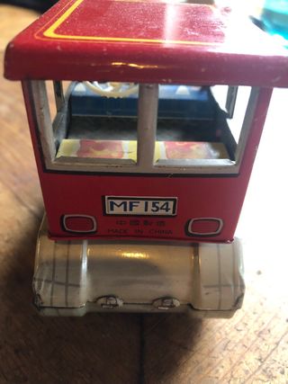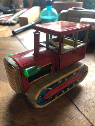 Este es un tractor de juguete antiguo, con un diseño clásico y llamativo. - Fabricado en metal. - Color rojo principal con detalles dorados y amarillos. - Cadenas de oruga. - Faros verdes.