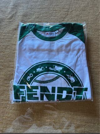 Camiseta de manga raglán con cuello y mangas en contraste verde. Presenta un diseño circular en el pecho con el logo de Fendt y varias máquinas agrícolas. - Camiseta oficial Fendt. - Diseño con temática agrícola. - Talla S.