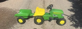 Tractor de pedales verde y amarillo con remolque. - Diseño inspirado en John Deere. - Incluye remolque. - Ruedas con detalles amarillos.