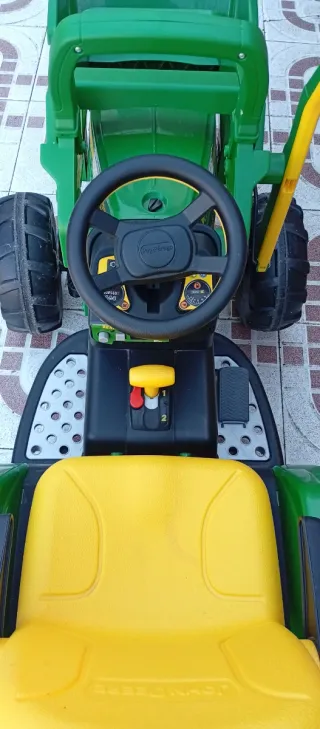 Tractor de pedales John Deere para niños, ideal para jugar al aire libre. - Pala frontal amarilla. - Asiento amarillo. - Volante negro. - Ruedas grandes con detalles amarillos.