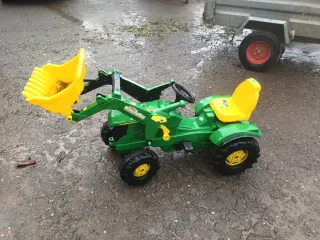 Tractor John Deere a pedales con remolque, ideal para que los más pequeños disfruten al aire libre. - Diseño robusto y colorido. - Incluye pala frontal. - Remolque acoplable para transportar objetos.