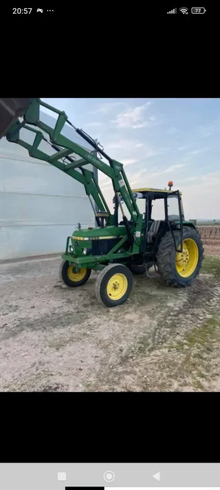 En ven tractor John deere 2120 simple tracció i 70 cv, amb pala de 3 pistons, cullera de 1,6m d’ample i forquiles per a bales rodones, embrague recén fet, rodes en bon estat. Tractor amb direccio i frens hidráulics. TRACTOR AMB DOCUMENTACIÓ PERO AMB MÉS DE 40 anys NO ES POT CANVIAR DE NOM ! Ideal finques. Tractor molt fiable !