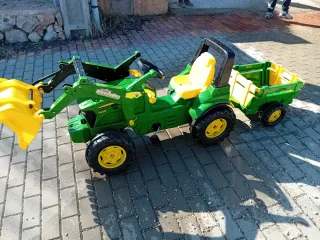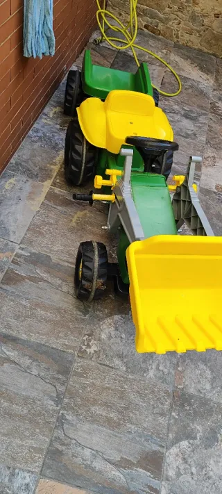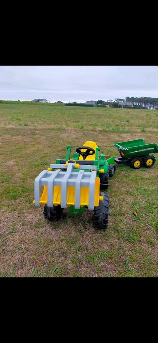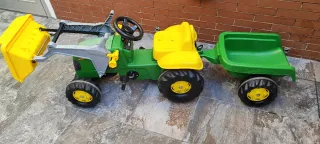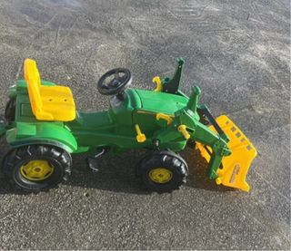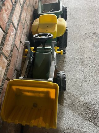 Tractor a pedales de la marca John Deere, ideal para que los más pequeños disfruten al aire libre. - Diseño robusto y colorido. - Pala frontal. - Volante. - Ruedas grandes. En perfecto estado. No incluye remolque pero si el enganche.