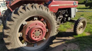 Tractor Massey Ferguson modelo 135, ideal para trabajos agrícolas. - Color rojo y gris. - Ruedas delanteras y traseras. - Asiento negro.