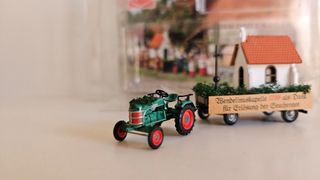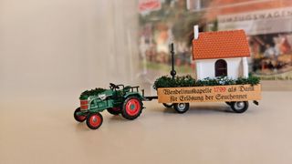 Busch 1:87. Tractor clásico con remolque y Capilla