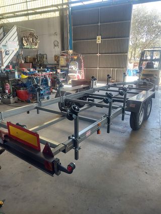 Remolque basculante eléctrico con ruedas dentro caja, carro doble eje reforzado. (El remolque queda plataforma plana, ya que sus laterales son abatibles) ideal para cargar por los lados, incorpora rampas debajo chasis para carga de quad, atv, mini tractor, maquinaria... Medidas de caja; 3500x1800 Provisto con dos ejes de 1350 kg cada uno, freno de inercia y estacionamiento. Fabricado en chapa lagrimada muy fuerte, con piso acabado madera finlandesa. Cajón delantero con cerradura y llaves. Cierres fundición. Rueda Hockey 60 mm. Lanza doble reforzada. Puente delantero. 5 Ruedas 195x50x13 de carga. Mvl 6--0.-2.-5.-.9-.6--1.-.2.-.9