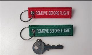 Llavero mini imitando la banderola que se utiliza con las pinzas p.ej.en las puestas en marcha de los aviones en los remolcados con tractores. Señalan elementos pinzados para evitar movimiento en algún dispositivo mecánico o cubiertas protectoras. Sólo se usan en tierra y han de ser retirados antes del vuelo (Remove before flight) Remove before flight rojo 2'5€ Remove before flight verde 2'5€ Kiss me before flight rojo 2'5€ Kiss me before flight verde 2'5€ Flight crew negro 5€. Drive safe, I need you here with me 1'75€