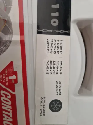 Cadenas para la nieve de 9 mm de grosor. - Talla 110. - Compatibles con medidas de neumático: 215/55x17, 225/55x16, 255/35x18, 215/60x17, 225/60x16, 255/40x17, 215/70x15, 235/35x19, 225/40x19, 235/40x18, 225/45x18, 245/45x17. - Peso neto: 3.65 KGS. - Peso bruto: 4.15 KGS.