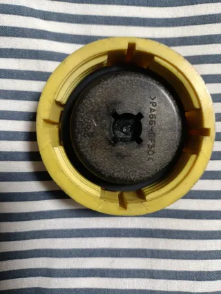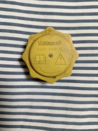 Tapón para el sistema de refrigeración para vehículos Ford. - Marca: Motorcraft - Referencia: 86FB-8100-GD - Símbolo de libro abierto - Símbolo de advertencia - Indicación de giro para abrir/cerrar