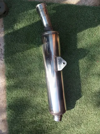 Tubo de escape para motocicleta. Presenta un acabado cromado en el silenciador y el resto del tubo es de color marrón óxido. - Silenciador cromado. - Tubo de escape de metal.