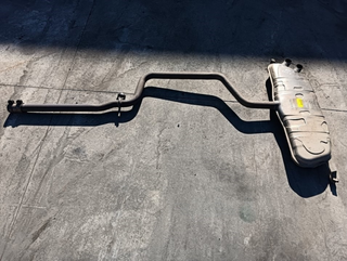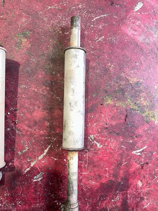 Sistema de escape para coche, compuesto por dos piezas principales. -Escape artesanal -Primer tramo y tramo final (cola) - Silenciador con acabado gris y detalles metálicos. - Tubo de escape curvo de metal. -Precio Poco negociable