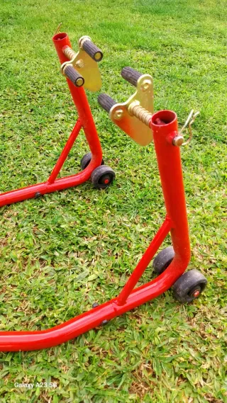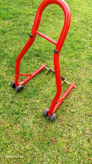 Caballete trasero para moto en color rojo. Permite elevar la rueda trasera para tareas de mantenimiento o almacenamiento. - Estructura metálica robusta. - Ruedas para facilitar el movimiento. - Soportes ajustables.