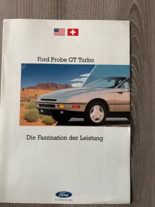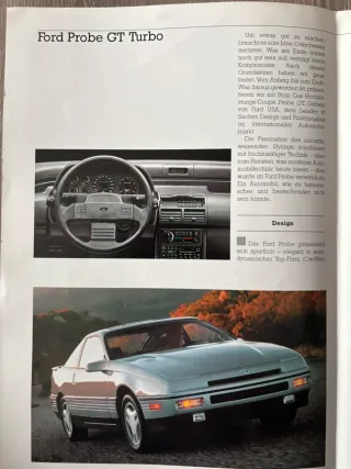 Catálogo original del Ford Probe GT Turbo del año 1989. Incluye imágenes del vehículo y texto promocional. - Modelo: Ford Probe GT Turbo - Año: 1989 - Idioma: Alemán