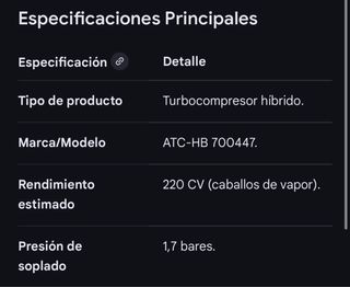 Turbo híbrido ATC-XX, preparado para 300cv. Se encuentra en perfecto estado, nuevo. Estado impecable, sin holguras ni fugas. Ideal para quien quiera mejorar rendimiento sin esperar semanas de pedido. Características: •Para 1.9 tdi •Modelo: ATC-XX •Potencia estimada: 300cv •Tipo: Híbrido •Estado: Como nuevo Se puede ver y probar. Envío o entrega en mano. Precio algo negociable.