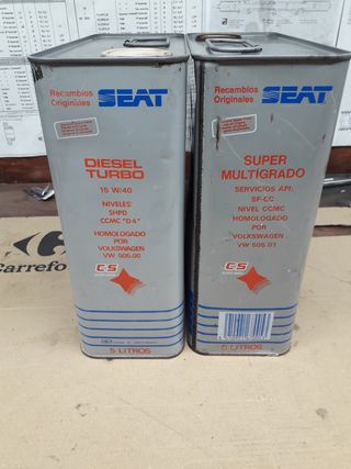 Dos latas de aceite de 5Litros originales seat aun sin abrir, una ellas aun tiene el precio pegado, super multigrado y turbo diesel, en buen estado, precio por unidad