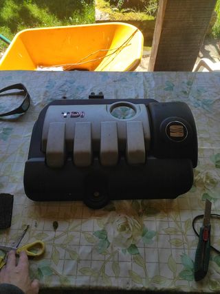 Cubierta de motor para Seat Alhambra 1.9 TDI. Está en buen estado, con algunos signos normales de uso. - Válida para motor 1.9 TDI. - Incluye la tapa del motor con el logo Seat. - Color gris plata y negro. Sharan, galaxy, ford, Volkswagen, grupo vag, asz, turbo