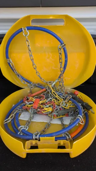 Cadenas para neumáticos de coche, ideales para condiciones de nieve o hielo. - Incluye caja de almacenamiento. - Cadenas de metal con recubrimiento azul.